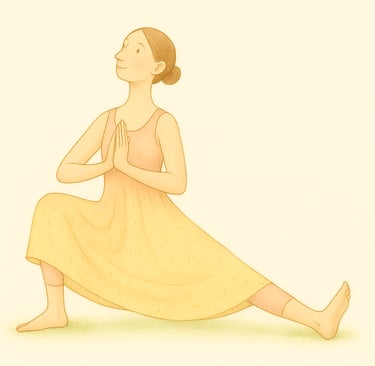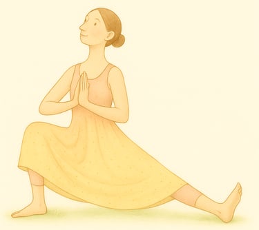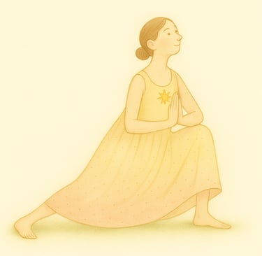 Beuge das rechte Knie tief, das linke Bein streckst du diagonal zur Seite – Ferse geerdet. Setz das Gesäß tief, Hände vor dem Herzen. Blick sanft nach oben. Spür die Öffnung in der Hüfte.
