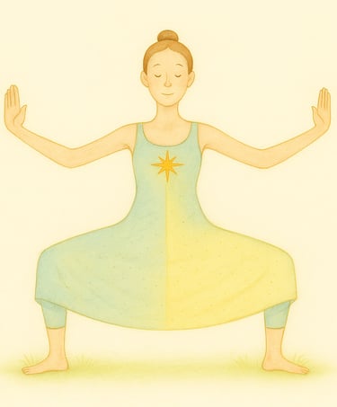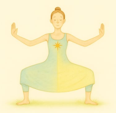 Du stehst aufrecht, Dein Gewicht ruht gleichmäßig auf beiden im Boden verwurzelten Fußsohlen. Deine Arme entspannt , Du atmest ruhig und richtest dich innerlich auf.