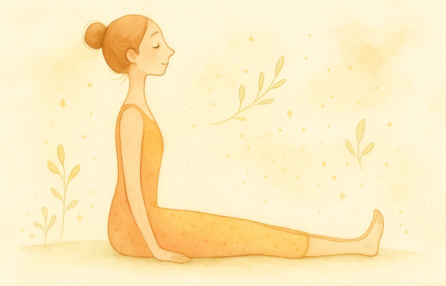 Hinweis / Kontraindikationen: Bei starken Rücken- oder Hüftproblemen die Haltung nur kurz oder mit Hilfsmitteln üben. Bei sehr straffen Beinrückseiten kann das Sitzen erschwert sein – ein Kissen unter dem Gesäß schafft Erleichterung.