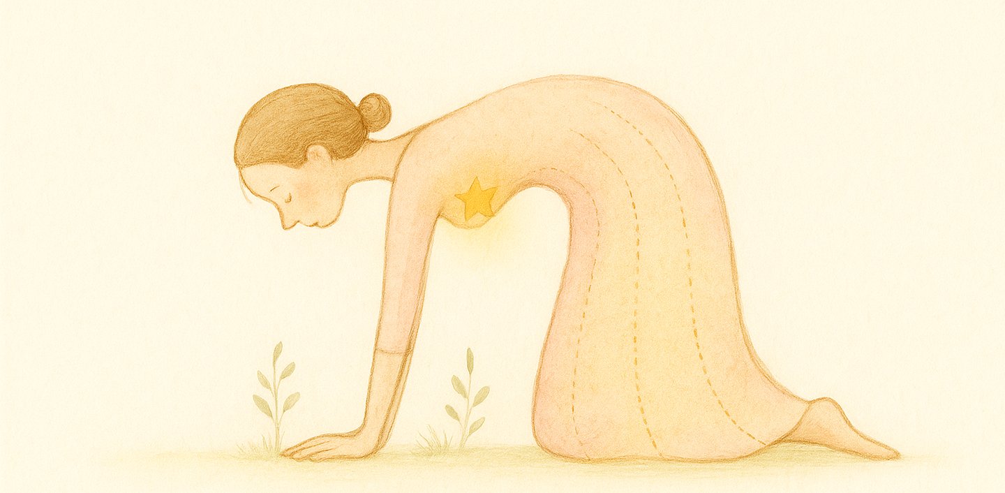 Schiebe Schulterblätter sanft auseinander, spüre die Weite im Rücken.
