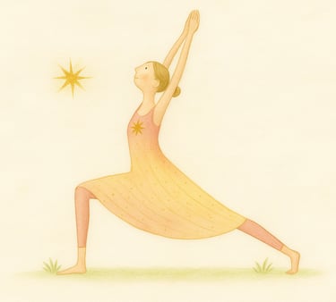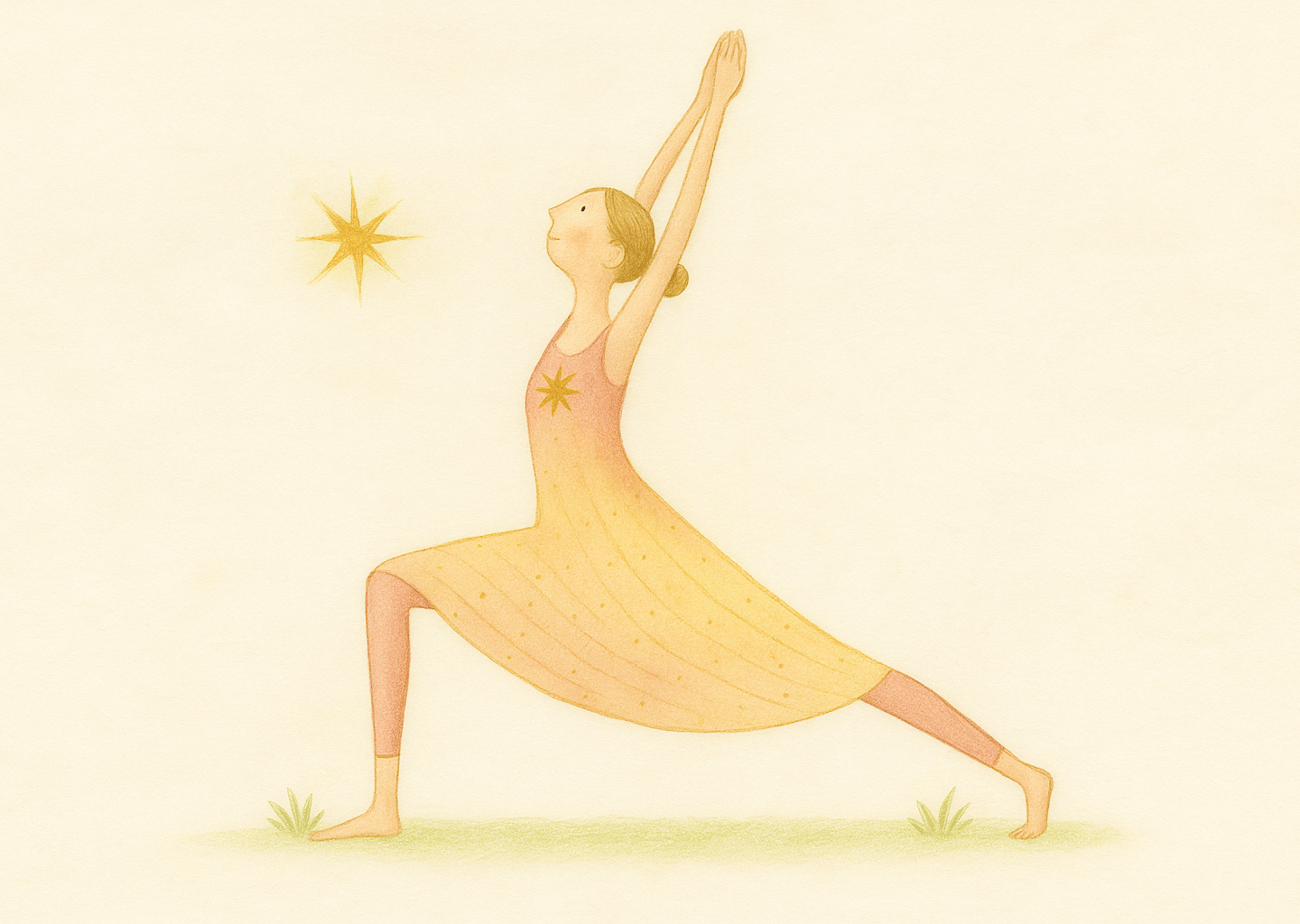 Virabhadrasana I steht für Entschlossenheit, Stabilität und den Mut, voranzuschreiten. Du lernst, zu stehen – aufrecht, geerdet und zugleich weich. Wie eine Kriegerin, die keine Rüstung braucht, weil ihr Mut von innen kommt.